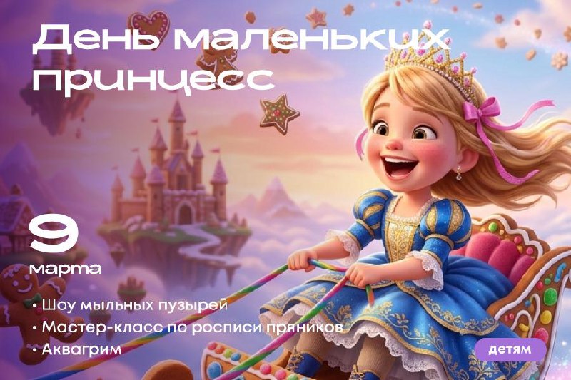 День маленьких принцесс в ТРЦ «Щёлковский» 🗓 9 марта с 13:00 до 16:00 💸 бесплатно 📍 Щёлковское ш., 75, 0й этаж Юных посетительниц ждут интерактивные игры с аниматорами, шоу мыльных пузырей, темат