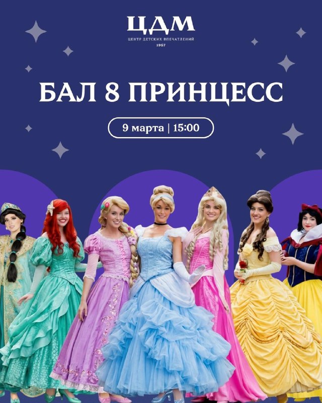 👑 Грандиозный бал принцесс в ЦДМ! 🗓 9 марта в 15:00 💸 бесплатно 📍 Театральный пр-д, д. 5/1, центральный атриум Ⓜ️ Лубянка В этот день в Центральном Детском Магазине оживут любимые героини сказок