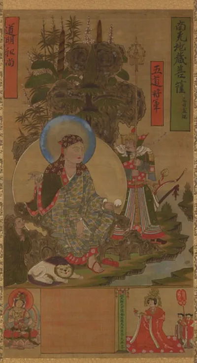 Одно из древнейших сохранившихся изображений бодхисаттвы Кшитигарбхи (地藏菩薩 / Дзидзо) — конец X – начало XI века, Северная Сун, Дуньхуан. Шёлк, тушь, краски и золото. Бодхисаттва, давший обет спасать в