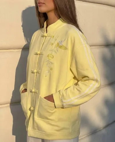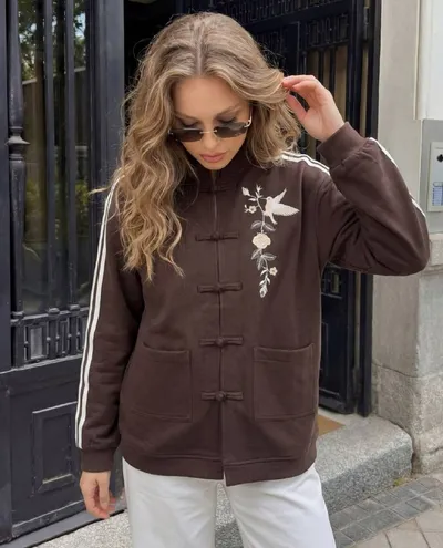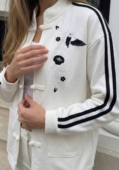 Этот бомбер — стиль с восточным настроением 🤍 Молочный оттенок, чёткие линии и деликатная вышивка с птицей — выглядит минималистично, но цепляет деталями. Есть ощущение спокойной роскоши и продуманн