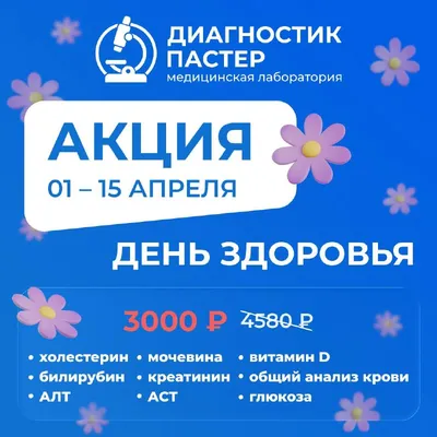 7 апреля - «ВСЕМИРНЫЙ ДЕНЬ ЗДОРОВЬЯ» И целых 2 недели, с 1️⃣по 1️⃣5️⃣апреля в «Диагностик Пастер» действует специальная акция «День здоровья». 💬 Комплекс исследований всего за 3000₽ вместо 4580₽