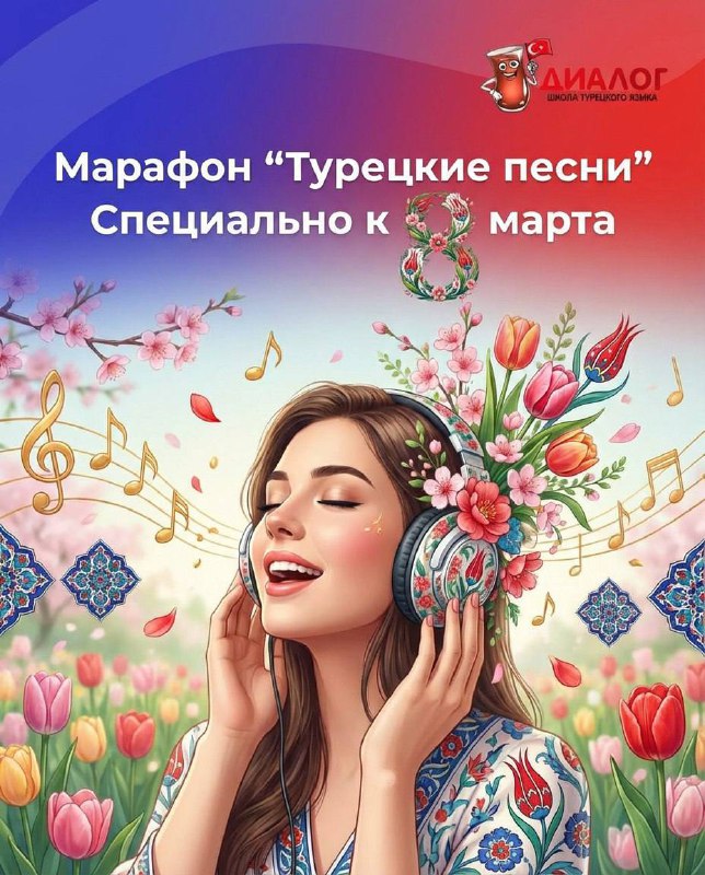🎶 Весна — время расцветать... и в языке тоже! 🥰 Приглашаем на наш бесплатный марафон по турецким песням, который пройдет с 7 по 9 марта здесь на нашем канале 🎙 Почему турецкие песни цепляют за ду