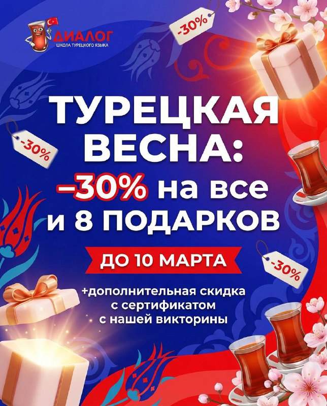 Турецкая весна: −30% на все и 8 подарков Весна — лучшее время начать учить турецкий. Три месяца обучения — и к лету вы уверенно говорите на турецком. 😱😱😱 До 10 марта выгода 30% на групповое и ин