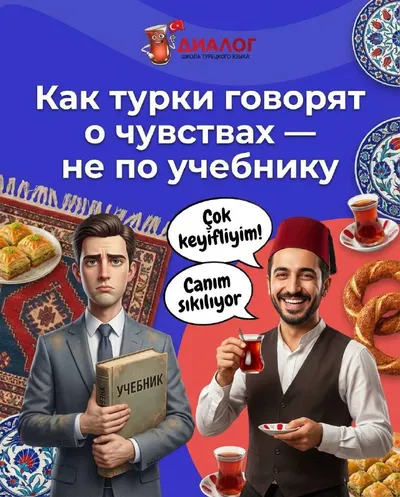 💭 Как турки говорят о чувствах — не по учебнику: учимся правильно образовывать фразы! Когда мы учим турецкий по учебнику, часто видим просто слова-переводы: «Я счастлив» — Ben mutluyum, «Я устал» —
