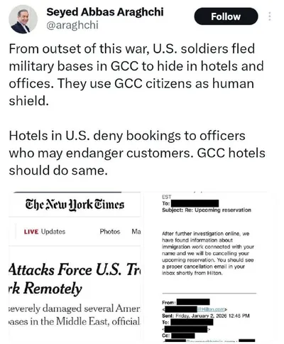 Арагчи: «С самого начала этой войны американские солдаты покинули военные базы в странах Персидского залива и скрываются в отелях и офисах. Они используют граждан стран залива как живой щит. Отели в