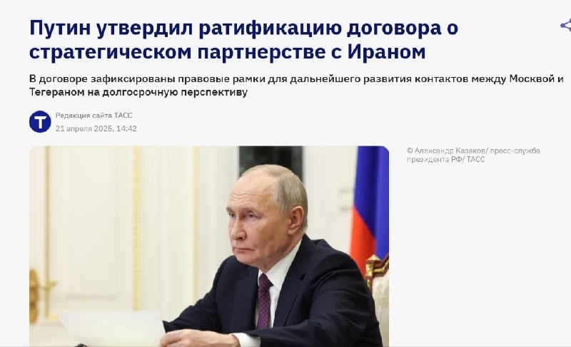 🤴 А вы знали, что весной 2025 года Россия и Иран подписали договор о стратегическом партнёрстве? Так в тексте договора указано, что он заключён на 20 лет, то есть до 2045, а Россия и Иран становятся