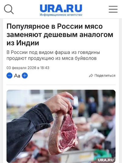 🥩 На фоне массового уничтожения скота Россию заваливают мясом буйволов из Индии В прошлом году импорт мяса крупного рогатого скота из Индии в Россию вырос вдвое. Из Индии при этом везут не говядину,