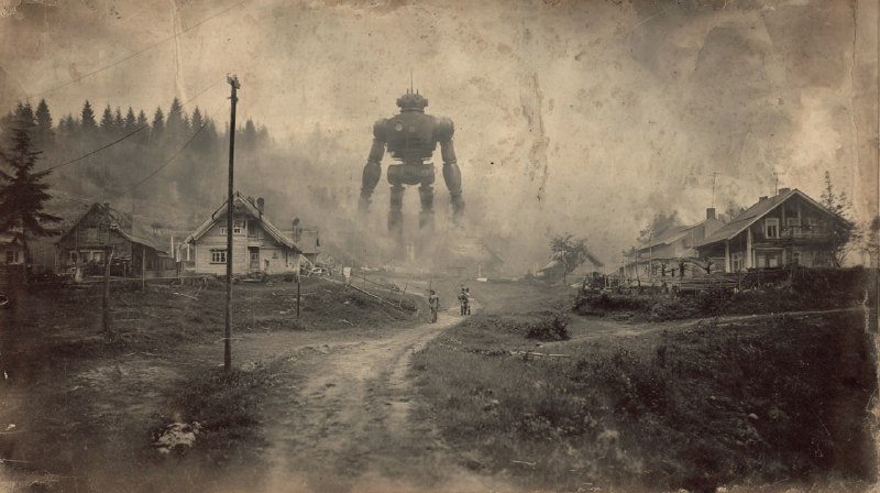 страшная старая фотография зловещего гигантского немецкого робота в венском сецессионе, швейцарская деревня, фумаролы, таежный пейзаж Midjourney | Диджитал