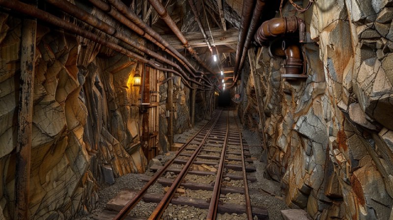Фотография с Nikon узкого ненадежного подземного туннеля, напоминающего глубокую угольную шахту, с неровными ржавыми железными путями в центре, неровными каменными стенами и деревянными опорными балка