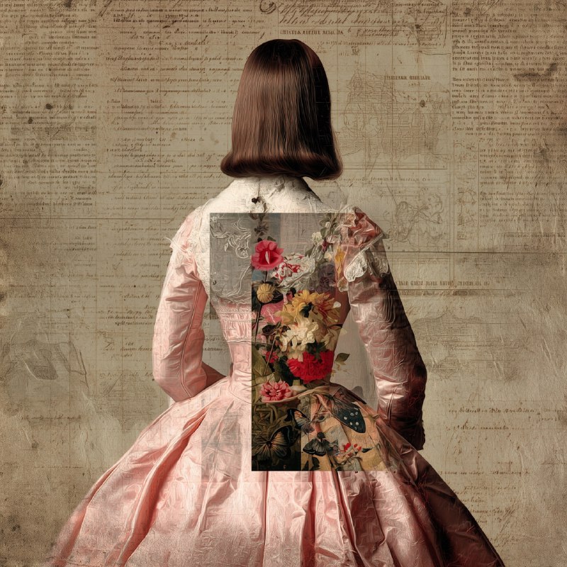 Лас Moderna meninas. Сюрреалистическая и поэтическая иллюстрация в стиле коллажа молодой женщины в полупрозрачном розовом викторианском платье. Узнаваемый силуэт платья от meninas. Внутри ее прозрачно