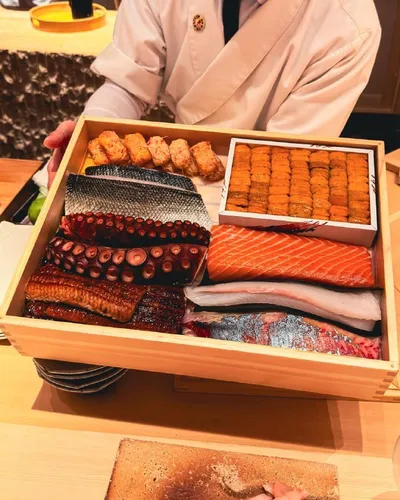 ネタ箱 Такая коробка называется нэта-бако (ネタ箱). В омакасе-ресторанах шеф выносит нэта-бако в начале ужина, чтобы показать гостю, с каким продуктом будет работать сегодня. Это одновременно и презентаци