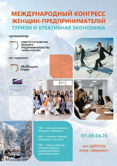 7–9 апреля 2026 Шерегеш, отель «Шермонт» В Кузбассе состоится Международный конгресс женщин-предпринимателей «Туризм и креативная экономика», организованный Комитетом по развитию женского предпринима