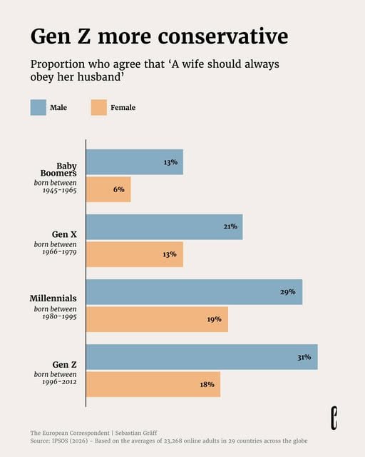 К 8 марта французский институт маркетинга и социальных исследований Ipsos привел неутешительный данные статистики: происходит поколенческий перепад отношения к женщинам — по всему миру молодые люди на