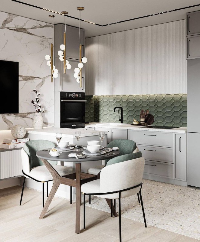 Светлая кухня-гостиная с пыльно-зелёными акцентами 📱 Дизайн: интерьер / лайфхаки