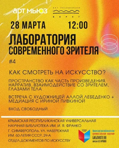 НОВАЯ ВСТРЕЧА «ЛАБОРАТОРИИ СОВРЕМЕННОГО ЗРИТЕЛЯ» — «ГЛАЗАМИ ТЕЛА» 2️⃣8️⃣.0️⃣3️⃣. (Сб) Симферополь Разговор будет о том, как мы воспринимаем искусство: только ли взглядом или всем телом сразу. Что пр