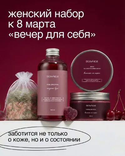 Мы решили сделать 8 марта чуть более тёплым — и подарить 5 боксов 🤍 Внутри — маленький ритуал для тела, когда хочется «обнять себя» без лишних слов: • Скраб для тела «Вишенка на торте», 250 мл • Мус