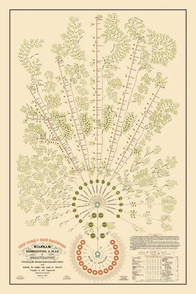 Ботаника на железной дороге Нашел потрясающий артефакт — оригинал одной из первых организационных схем в истории (рассмотреть в деталях). Ее создал Дэниел МакКаллум в 1855 году, когда возглавлял Нью-