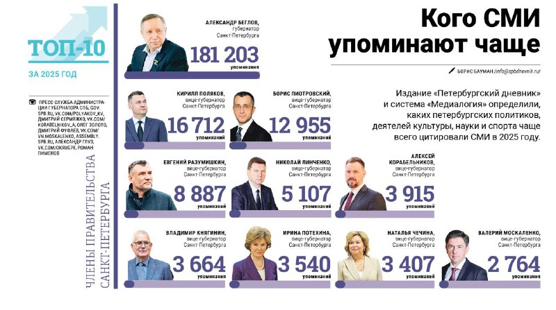 📊 Кого чаще всего цитировали СМИ в Петербурге? «Петербургский дневник» совместно с аналитической системой «Медиалогия» составил рейтинг самых упоминаемых в СМИ петербургских политиков, деятелей куль
