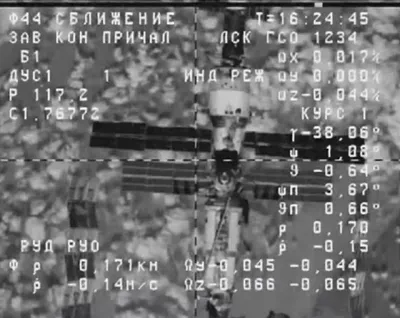 Кстати, стыковка начинается с момента касания штанги корабля со станцией. Ускоренно момент подхода корабля и касание штангой станции. Дальше мы видим, что происходит стягивание штанги на стыковочном