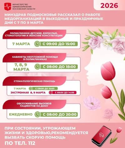 Режим работы больницы в Долгопрудном 7-9 марта ✔️Взрослая/ детская/стоматологическая поликлиники/женская консультация - 7 марта прием записавшихся заранее - с 9:00 до 15:00 ✔️С острой зубной болью