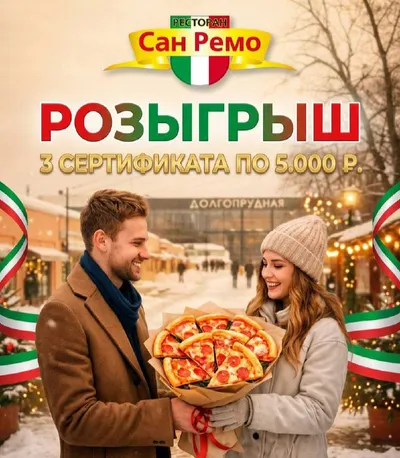 Erid: 2VtzquiKin9 Розыгрыш! 3 сертификата по 5.000 ₽ в ресторан САН РЕМО Чтобы участвовать: ✔ Подпишись на аккаунт САН-РЕМО https://t.me/sanremo_dolgopa И под постом с розыгрышем напиши любое люби