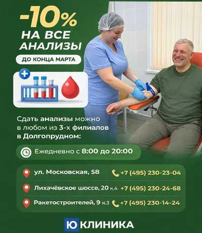 Erid: 2Vtzqxkx2h3 Полезная акция для жителей Долгопрудного. В Ю-Клинике началась акция –10% на все анализы до конца марта. Сдать анализы можно в любом из 3-х филиалов в Долгопрудном: 🕗 Ежедневно