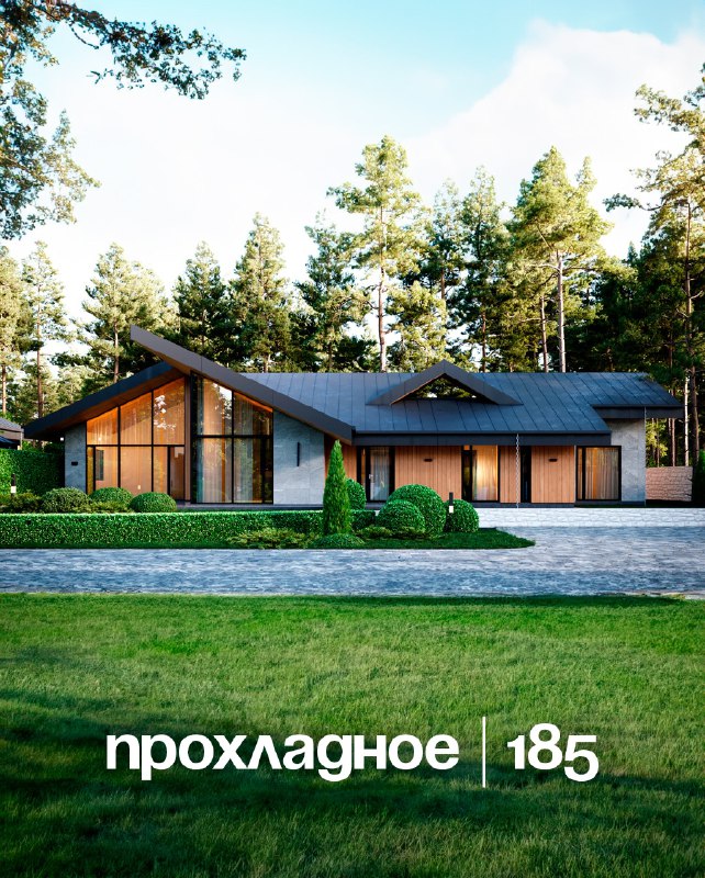 Смотрите, какой красавец — не просто «коробка», а дом с характером. Окна во всю стену, чтобы свет заливал всё внутри. Терраса с камином — для вечеров под звёздами 🤩 Газон, кусты, деревья — всё доба