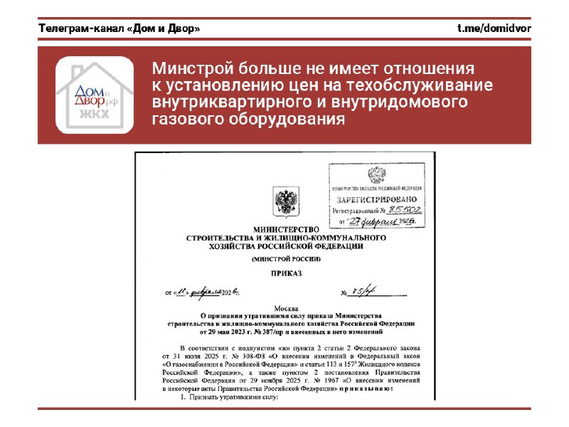 Минстрой больше не имеет отношения к установлению цен на техобслуживание внутриквартирного и внутридомового газового оборудования Вчера опубликован приказ Минстроя России от 11 февраля 2026 года №75/