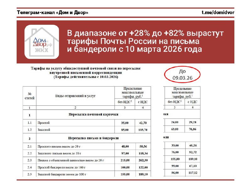 В диапазоне от +28% до +82% вырастут тарифы Почты России на письма и бандероли с 10 марта 2026 года Если вы пользуетесь услугами Почты России, например, рассылая уведомления об проведении общих собра
