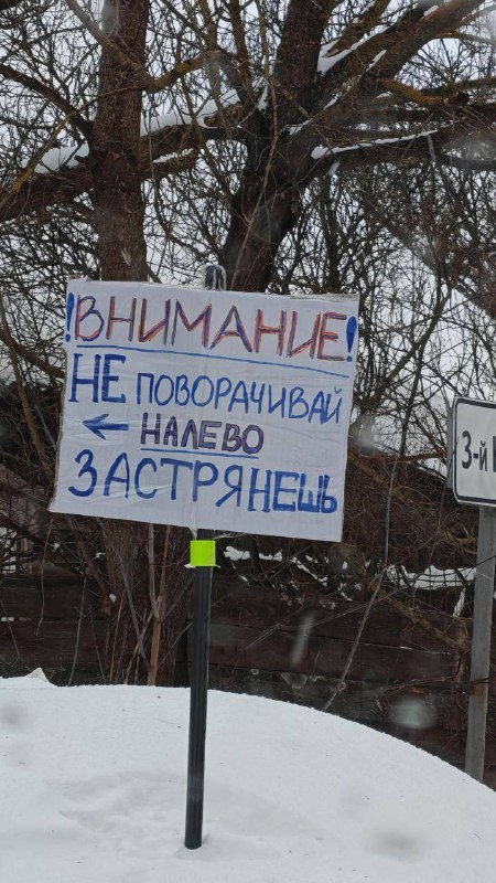 На Южной улице в Домодедово жители установили самодельные таблички с надписью «Внимание! Не поворачивай налево — застрянешь!». Дорогу здесь не чистят от снега и машины регулярно застревают в сугробах