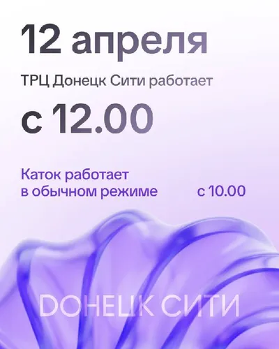 🕊 График работы ТРЦ «Донецк Сити» 12 апреля — торговый центр работает с 12:00 ⛸ Каток — в обычном режиме с 10:00 С 13 апреля — работаем в обычном режиме 🐣 Поздравляем с наступающим Светлым празд