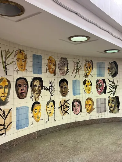 Раза три я фотографировала это панно, украшающее восточный вестибюль Белорусской (кольцевая) и всё никак не могла выложить, так как необходимо пояснение. Вот пояснение: это панно «Лица мира» 1997 го