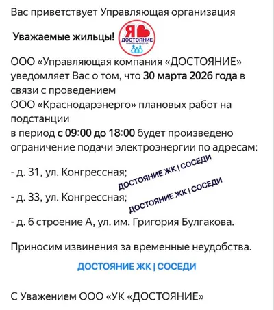 Новости и СМИГлавное сообщество соседей ЖК «Достояние» г. Краснодар Сообщить новость! Предложить вопрос на обсуждение! (в том числе анонимно) пишите сюда➡️ @dostoianie_admin_bot
