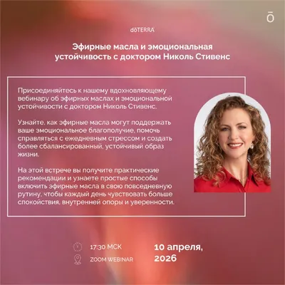 Друзья! Приглашаем на вебинар: "Эфирные масла и эмоциональная устойчивость" с доктором Николь Стивенс, вице-президентом по клиническим исследованиям компании dōTERRA. Эмоциональная устойчивость начи