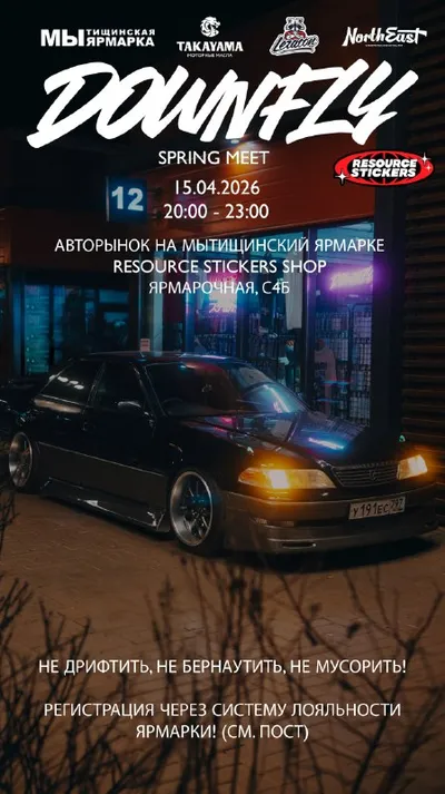 DOWNFLY SPRING MEET 15/04/2026 20:00 - 23:00 Авторынок Мытищинской Ярмарки Resource Stickers Shop Ярмарочная, С4Б НЕ ДРИФТИТЬ! НЕ БЕРНАУТИТЬ! НЕ МУСОРИТЬ! НУЖНА РЕГИСТРАЦИЯ В СИСТЕМЕ ЛОЯЛЬНОСТИ!