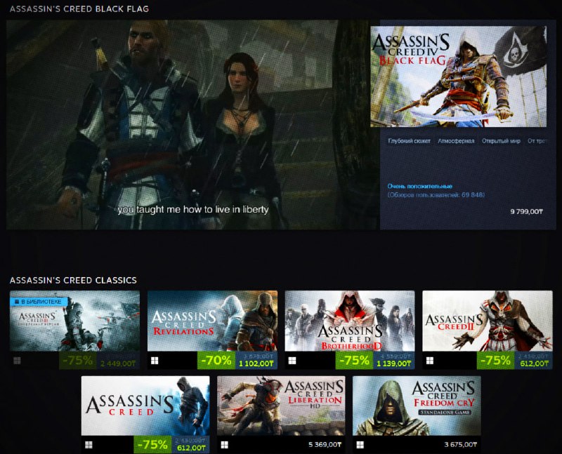 ⚡️В Steam стартовала крупнейшая распродажа Assassin's Creed Классику можно урвать за сотку, а более поздние части — всего за 300-400 рублей Затариваемся до 12 марта с казахских акков 👾DPG