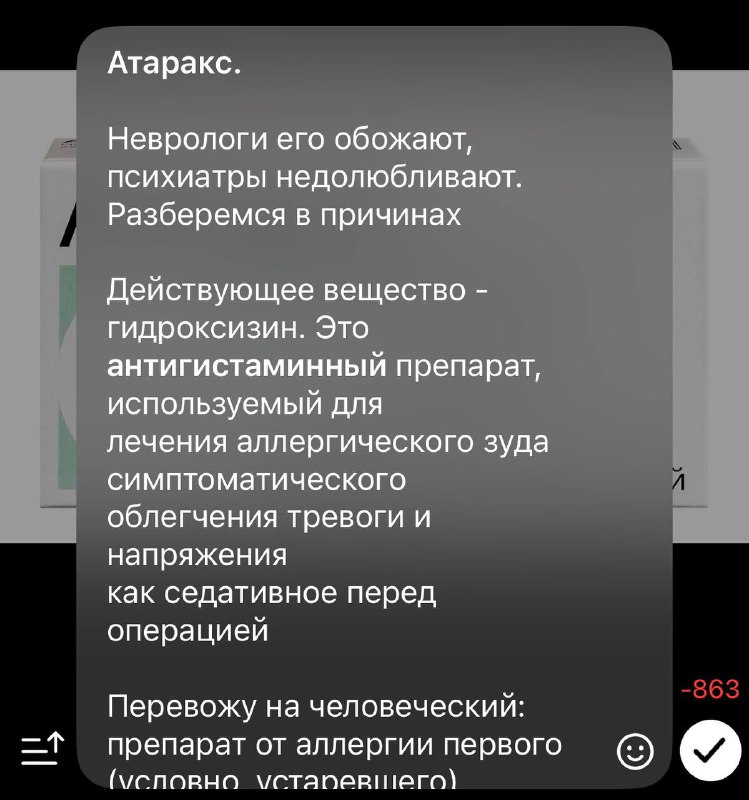 Атаракс. Неврологи его обожают, психиатры недолюбливают. Разберемся в причинах Действующее вещество - гидроксизин. Это антигистаминный препарат, используемый для: ✅лечения аллергического зуда ✅симп