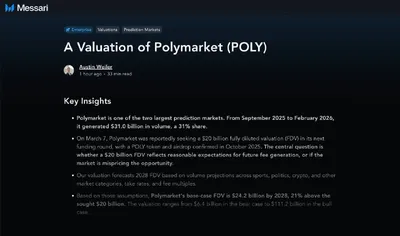 ✅$POLY по $111B FDV, верим? Такой прогноз дал Messari Один из самых топовых и крупных Research проектов Messari, дал прогноз по $POLY и их выходу https://messari.io/report/a-valuation-of-polymarket-