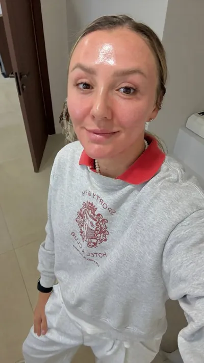 Сфотографировала себя всего через час после процедуры. Полежала на ФДТ 25 минут, затем нанесли экзосомы — и ощущение, будто ничего и не делали. Хотя на видео видно, что у меня была даже кровяная роса