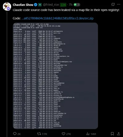👍 Anthropic случайно слила исходный код Claude 512 000 строк кода стали публичными из-за ошибки в npm-пакете. Код мгновенно разошёлся по GitHub, набрав тысячи звёзд за несколько часов. Бесплатно исп