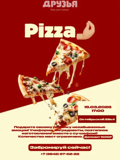 🔥СЕГОДНЯ🔥 ДЕТСКИЙ КУЛИНАРНЫЙ МАСТЕР-КЛАСС👩🍳 В баре «Друзья» пройдёт кулинарный мастер-класс по приготовлению пиццы👀 Разбавьте этот вечер чем-то новым, приятным, атмосферным🍕 ⚡️⚡️⚡️⚡️ • Запи