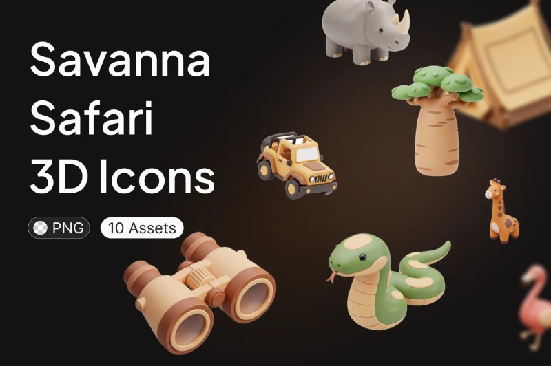 3D-иконки сафари Форматы: #PNG В этом очаровательном наборе трехмерных значков представлен восхитительный набор элементов саванны на тему сафари 📁 Скачать