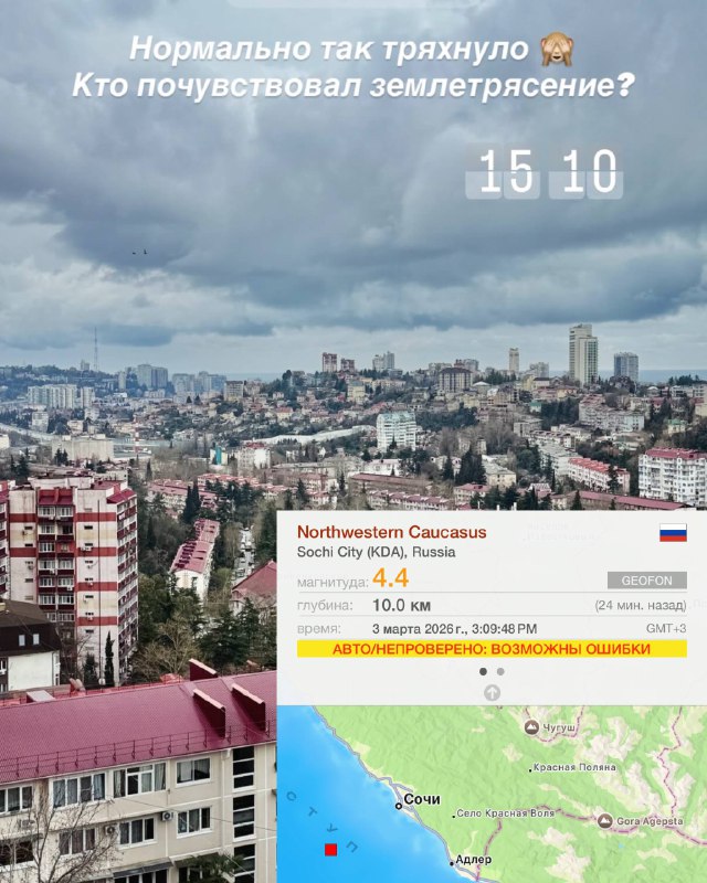 🌍 В Сочи зафиксировали землетрясение магнитудой 4,4 Эпицентр находился всего в 27 км от Сочи на глубине 10 км. 🔎 Сочинцы, а вы это почувствовали? ✅ Подписаться | Предложка