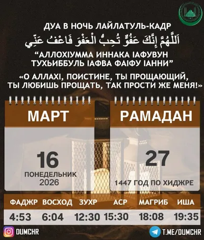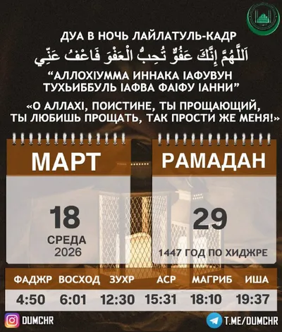Дорогие братья и сестры! В Саудовской Аравии не было зрительно зафиксировано новолуние, поэтому, следуя сунне ПОСЛАННИКА АЛЛАХlА ﷺ завтра в четверг 19 марта 2026 года мы будем держать пост. Праздни