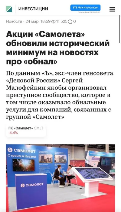 Скандал. Самолет подозревают в схемах с обналом 2 млрд рублей 😱 Акции застройщика за день рухнули на 5,64% — до самого низкого уровня за всю историю. Причина — арест одного из руководителей «Деловой