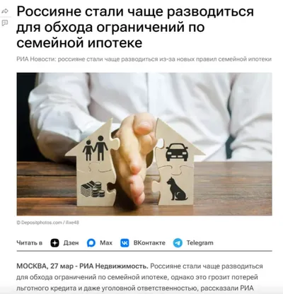 Россияне массово разводятся ради двух семейных ипотек 🙈 С 1 февраля на одну семью дают одну семейную ипотеку, а супруги становятся созаёмщиками. Чтобы обойти ограничение, россияне стали массово разв