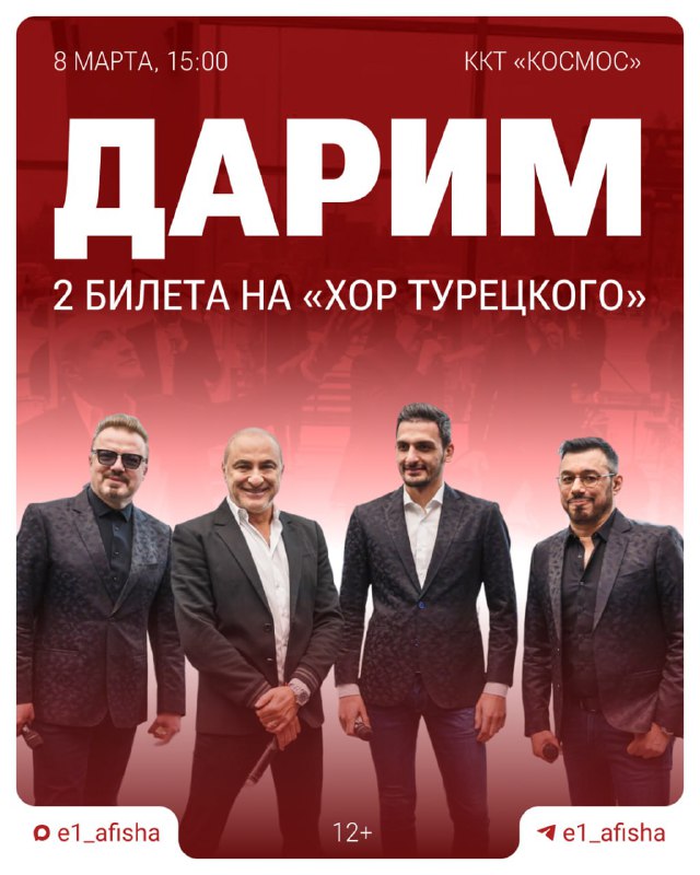Дарим билеты на концерт «Хора Турецкого»! Он пройдет в самый женский день в году — 8 марта. Прозвучат баллады о любви и мировые хиты в эксклюзивных аранжировках. Шоу будет в ККТ «Космос» в 15:00.