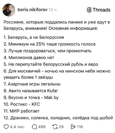 Белорусы сделали памятку для россиян, которые хотят переехать в Беларусь из-за постоянных блокировок и ограничений. 12-й пункт заманчивее всего. Подпишись, у нас интересно❤️