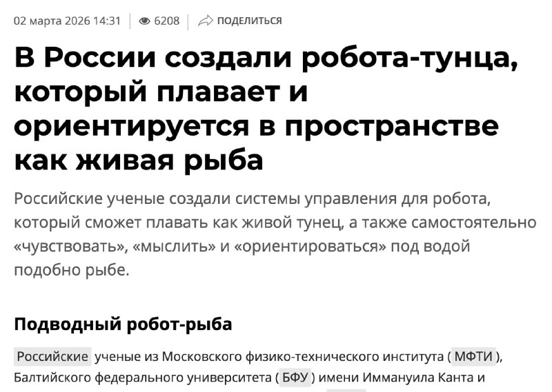 А теперь к важным новостям: в России создали робота-тунца, который плавает и ориентируется в пространстве как живая рыба. Ученые из МФТИ, Балтийского федерального университета и ННГУ им. Лобачевского