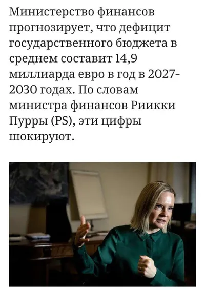 Министр финансов Финляндии поражён величиной долгов, которые накапливает страна. Ожидается, что к 2030 году государственный долг составит 260 миллиардов евро. За последние три года он увеличился на 60